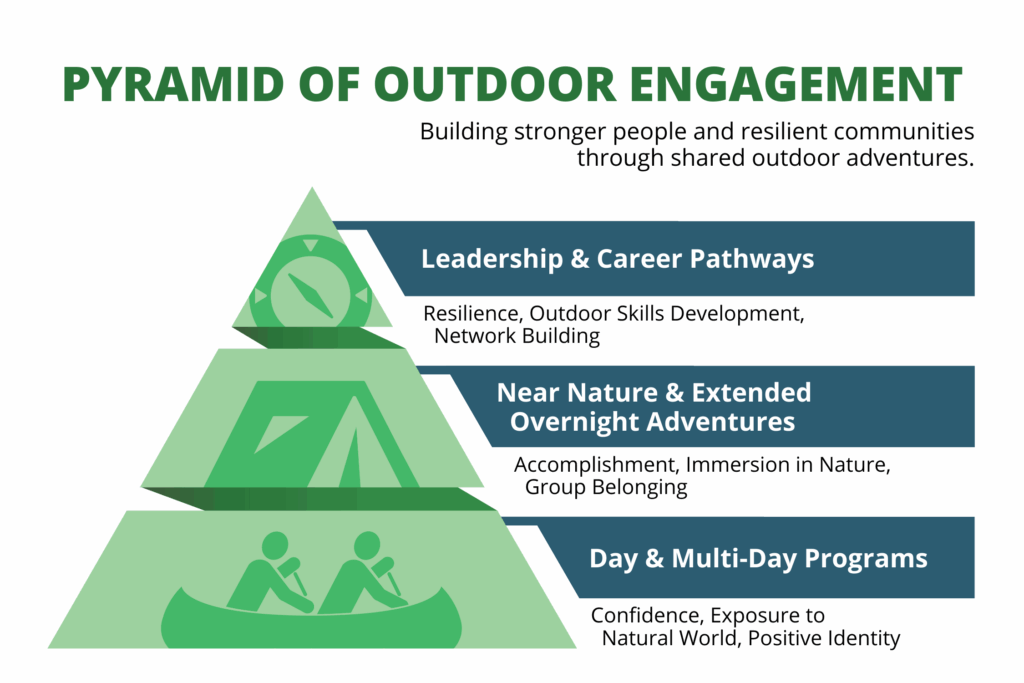 The Pyramid of Outdoor Engagement provides a progression of outdoor experiences for youth, adults, and families designed to engage participants in a lifelong relationship with the outdoors. This extends from introductory activities through Canoemobile, to more immersive adventures through our Near-Nature and Extended overnight adventures, to career and leadership pathway programs. This model is designed to provide participants with a continuum of experiences that: