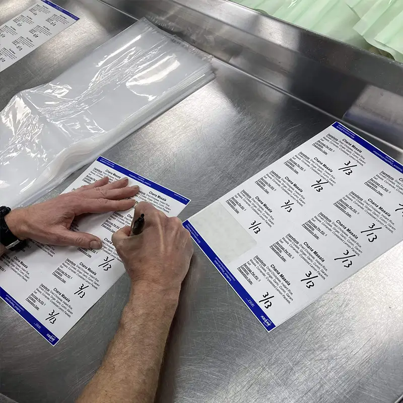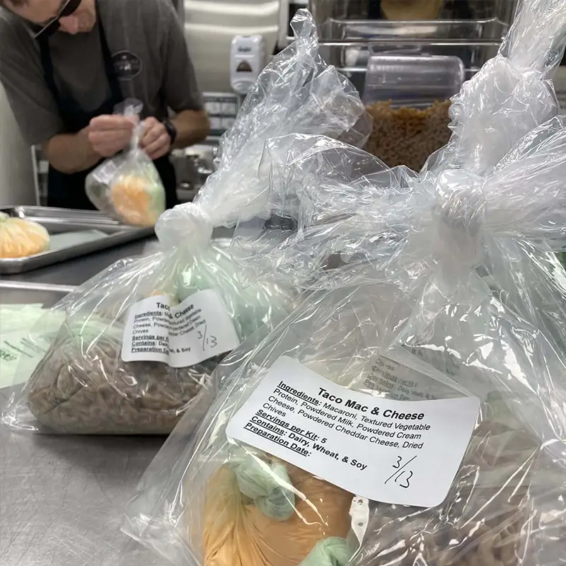 One recent morning, we welcomed four volunteers for several hours of meal kit preparation. After a brief orientation from Danee, and thoroughly washing up, they dug right in. On the menu first: Hash Browns and Taco Mac & Cheese. From scooping dehydrated potato flakes and spiral noodles to labeling stickers and baggies to tying and organizing them, it was all-hands-on-deck, and both work and time flew by.