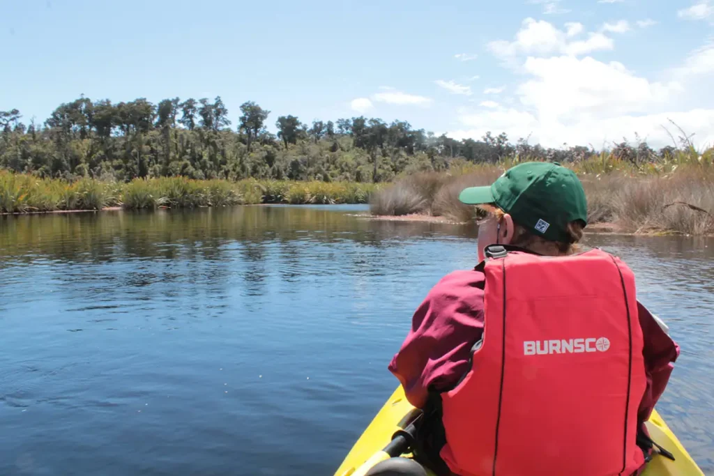 Laura kayaks in a lagoon in the beautiful Hokitika region of the West Coast.