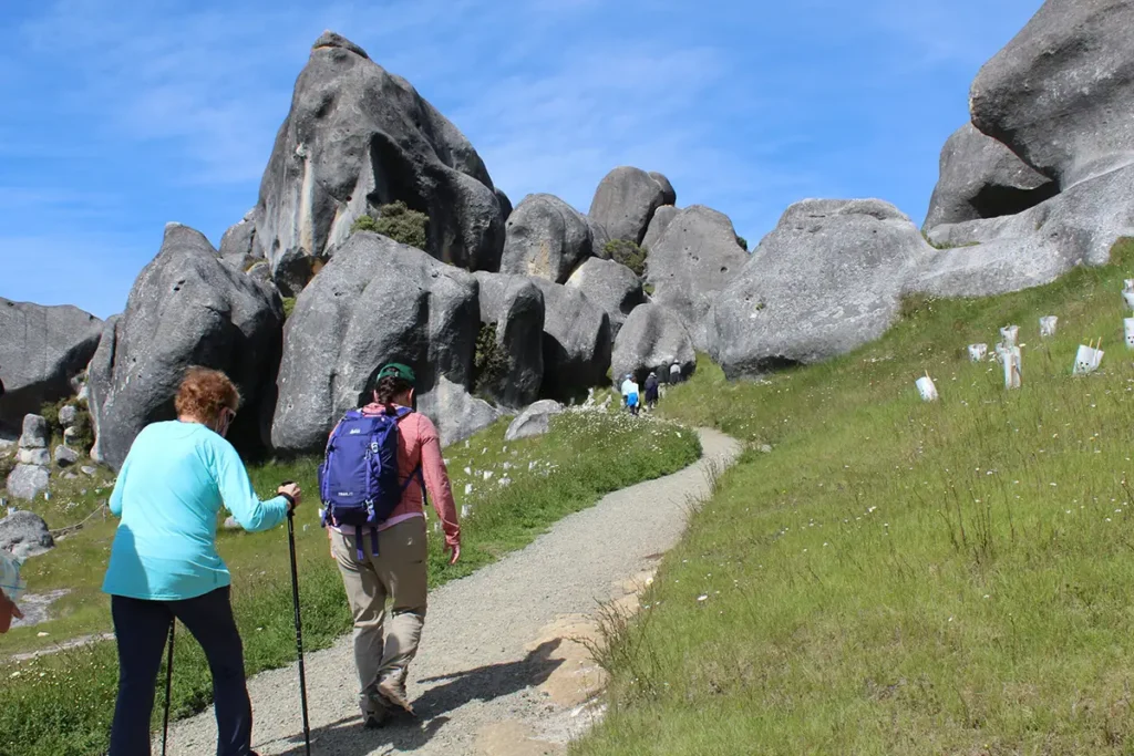 Erika assists Laura by walking in front of her along the trail through the limestone rocks of Kura Tawhiti, or Castle Hill.