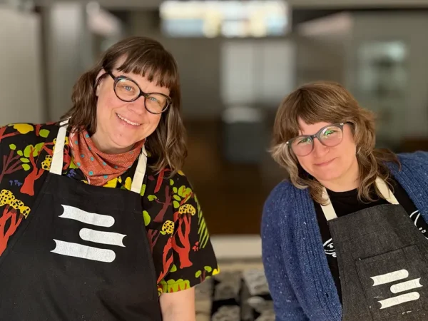 Laura Brown and MC Hyland have a combined 40+ years of experience as teachers of printmaking, book arts, and creative writing. Laura is a printmaker and textile artist who works with salvaged materials to make community-oriented artwork with a colorful and graphic sensibility. She makes postcards, prints, quilts, and many other things that make people ask “is it art or is it a craft?” MC is a poet, publisher, scholar, teacher, and public artist. She has published three books of poetry and one book of short essays and has, since 2008, run DoubleCross Press, which produces handmade books of poetry by emerging and mid-career poets. MC and Laura met at Minnesota Center for Book Arts in 2009, and have been friends and collaborators ever since.